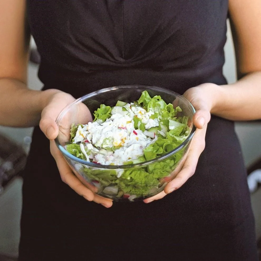 ШАГ 4 Оставшийся белок натереть на терке. Заправить салат соусом, сверху посыпать тертым белком.