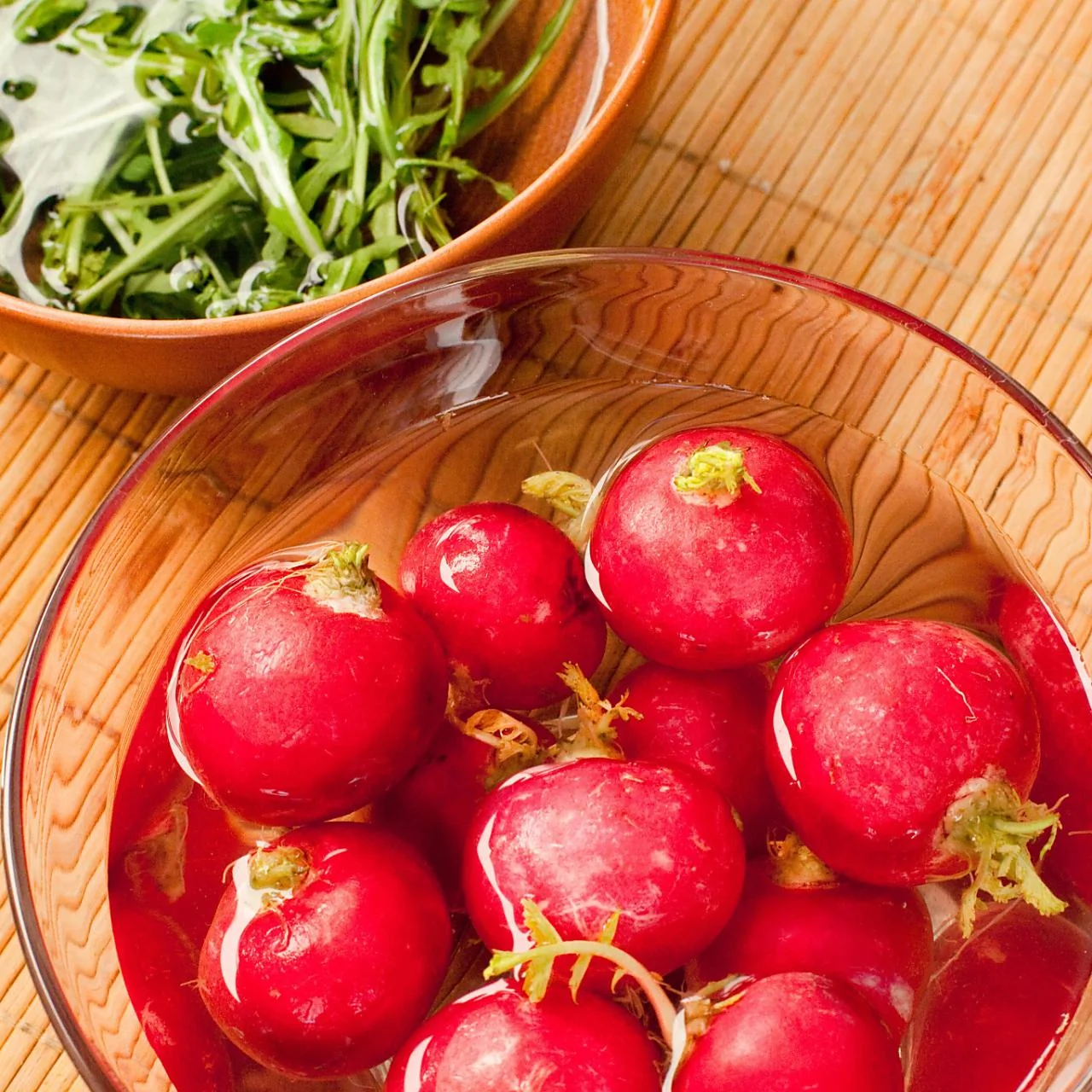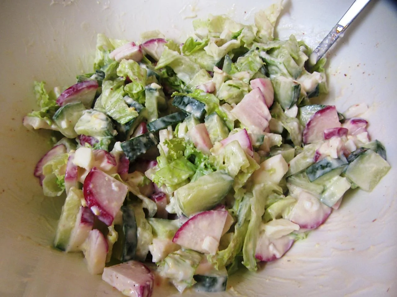 ШАГ 2 Огурцы и редиску мелко нарезать, листья салата — тоже нарезать небольшими лопухами.