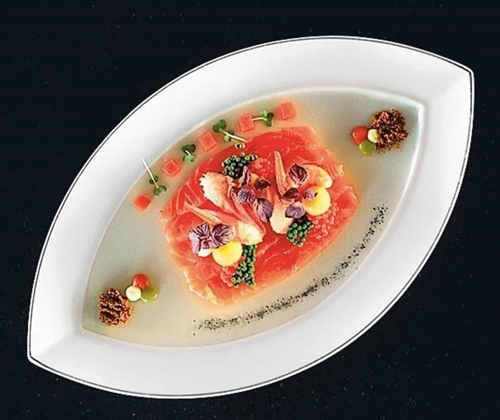 ШАГ 8 Вынуть из холодильника блюдо с желе из сельдерея. С двух сторон блюда сделать капли пюре из гороха и моркови, майонеза и хлебной земли. В центре на сырную массу выложить ломтики лосося, на них — шейки зашпаренных раков и перепелиные желтки. Украсить блюдо желе из перца, черной солью и ростками кресс-салата и салата шизо.