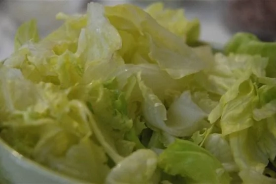 ШАГ 1 Листья салата порвать руками. Огурцы нарезать кубиками. Черри — половинками. Лук — полукольцами.