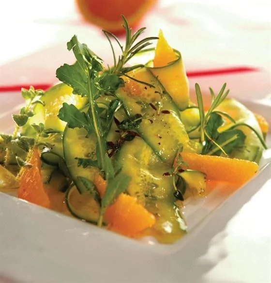 Салат из огурцов со свежими травами, дольками апельсина и цедрой