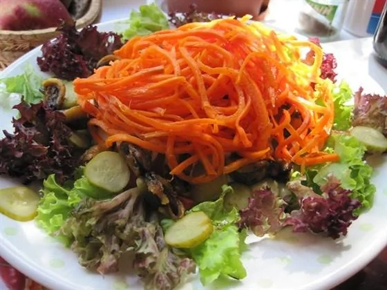 ШАГ 5 Сверху выложите корейскую морковку «шапочкой«». Постарайтесь выложить так, чтобы остальные ингредиенты не были видны.