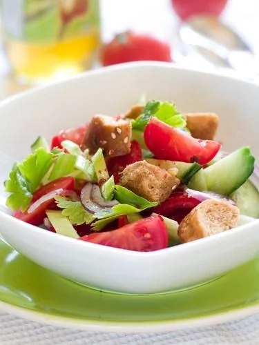 ШАГ 3 В большой миске смешать хлебные кубики, нарезанные кубиками помидоры, нарезанный кубиками огурец и базилик. Сбрызнуть уксусом и оливковым маслом, посолите и поперчите. Перемешать и подать.