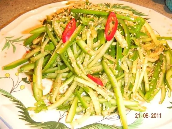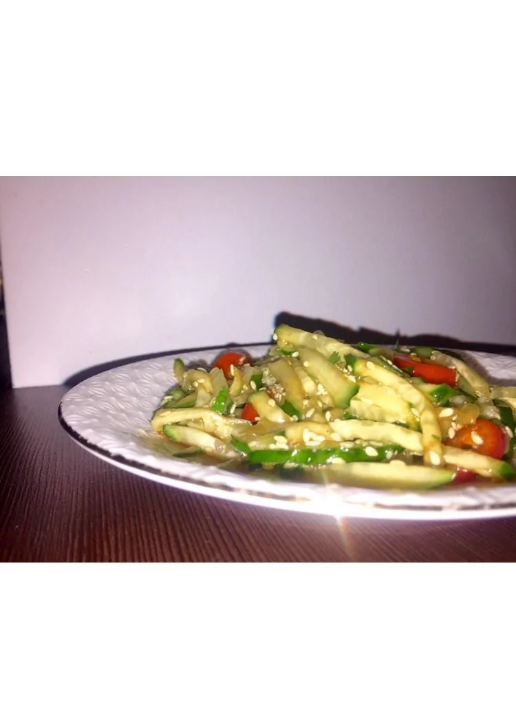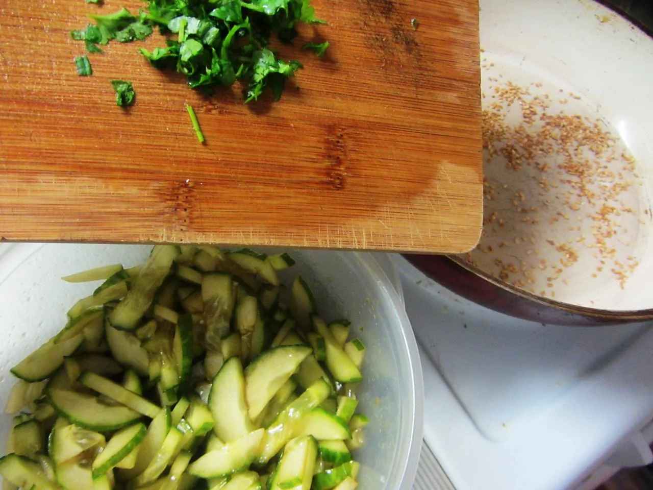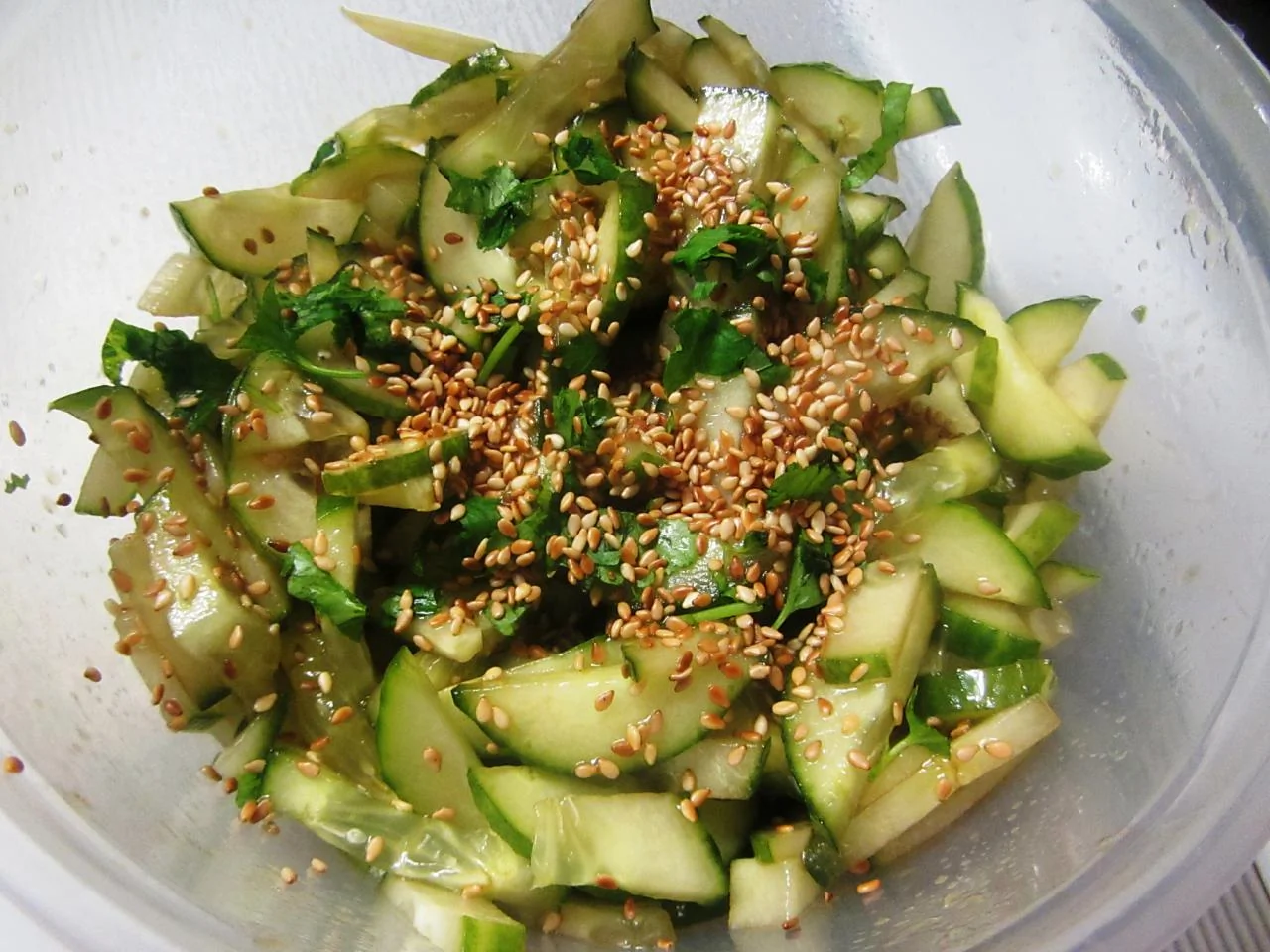 ШАГ 5 Смешать огурцы с соусом, добавить кинзу и сверху посыпать кунжутом.