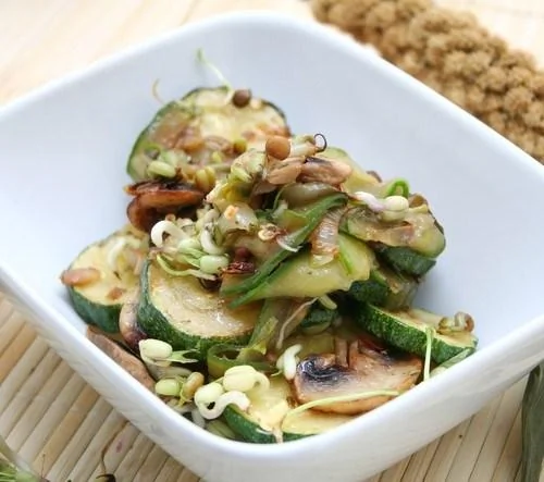 ШАГ 1 Цукини нарезать небольшими кусочками и обжарить на растительном масле. Грибы вначале отварить, затем обжарить.