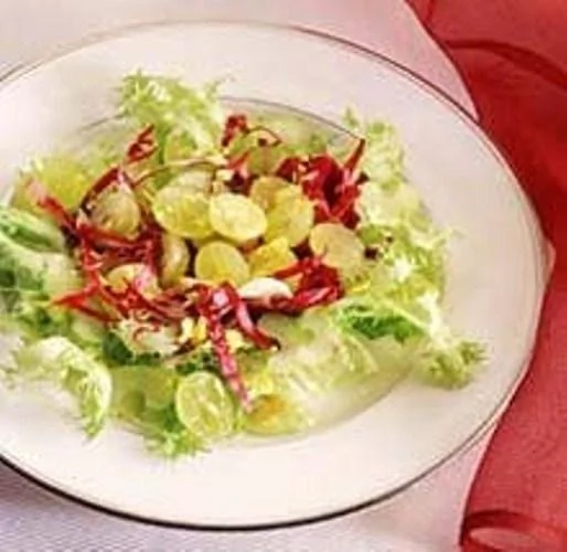 ШАГ 1 Салат фризе вымыть, нарезать и положить в салатник. Радиккио вымыть и нарезать полосками. Выложить в середину салата. Сельдерей нарезать кубиками. Виноград вымыть, разрезать пополам, избавиться от косточек. Сельдерей и виноград выложить на радиккио.