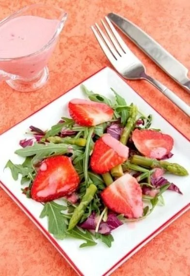ШАГ 5 Разложить рукколу по тарелкам, сверху выложить спаржу и клубнику. Полить салат карамельным соусом и оставить на 30 минут.