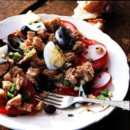 Помидоры Сладкий перец Консервированный тунец в масле Редис Яйцо куриное Консервированное филе анчоуса Соль Лук-резанец Перец черный молотый Маслины без косточек в масле Оливковое масло Салаты Французская кухня