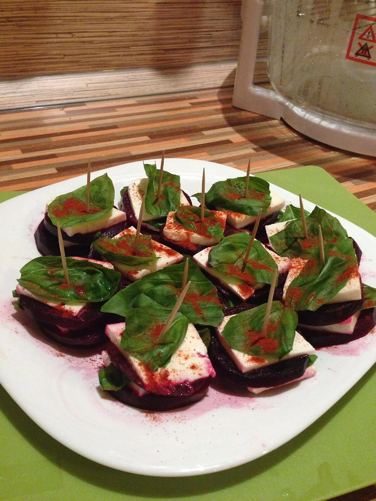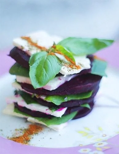 ШАГ 2 Тонко нарежьте брынзу. Каждый ломтик свеклы полейте лимонным соком, сверху положите брынзу и листик шпината. Так повторите несколько слоев, закончив верхушку брынзой и украсив ее листиками базилика.