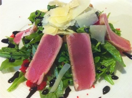 ШАГ 5 Листья рукколы выложить в центр тарелки, по кругу выложить нарезанного тунца, полить бальзамическим кремом, сверху посыпать тертым сыром и икрой летучей рыбы.