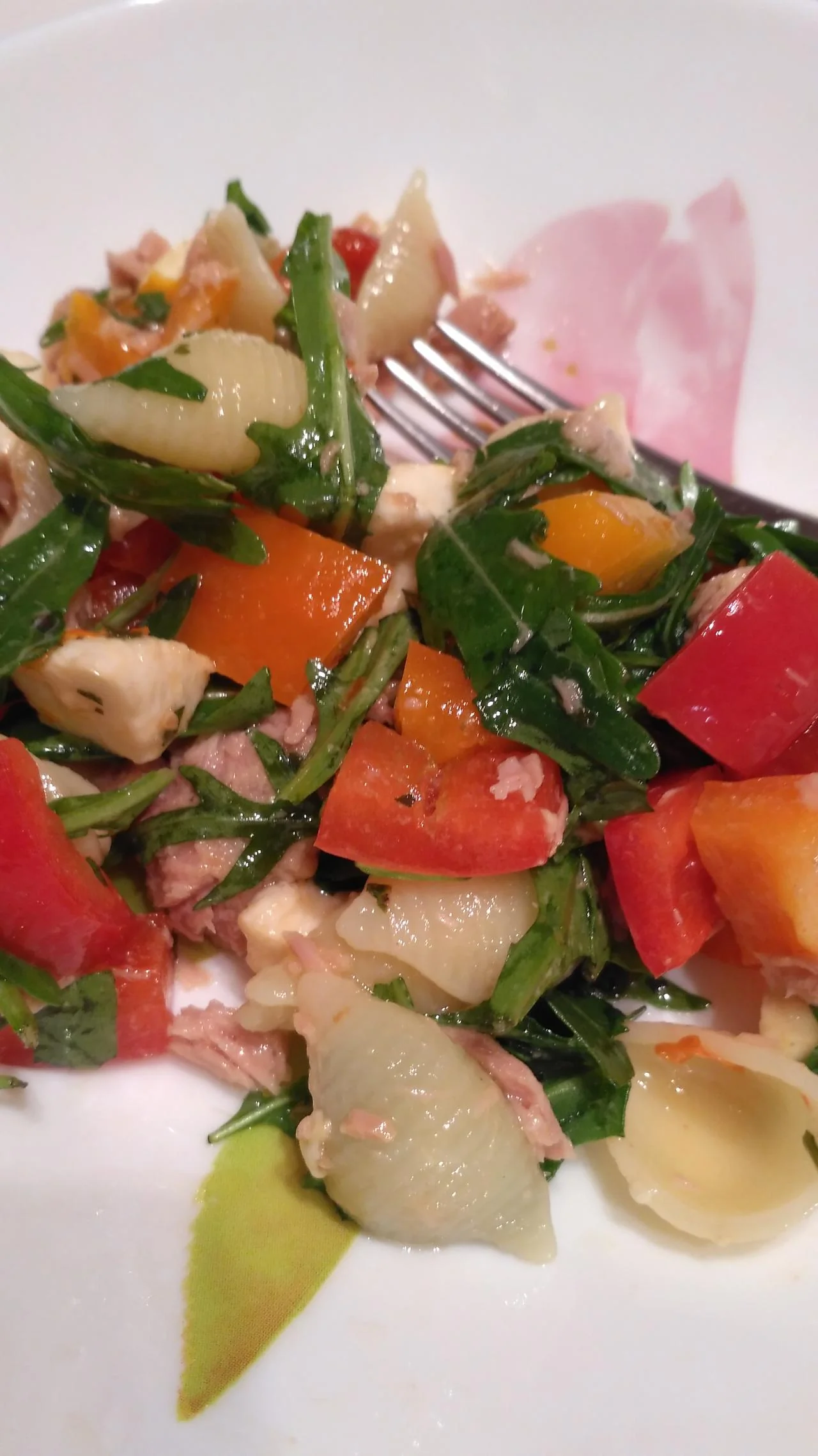 ШАГ 5 Смешать вышеперечисленные ингредиенты и тунца с пастой, заправить, хорошо перемешать, перед подачей добавить рукколу (также немного перемешать, чтобы руккола оставалась хрустящей).