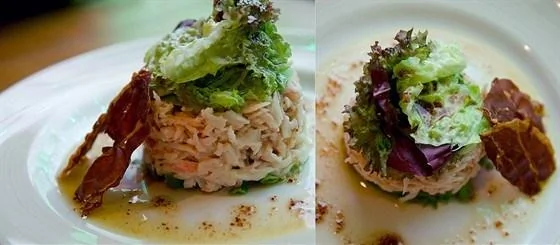 Салат из авокадо и крабового мяса под кедровым соусом с гренкой из хамона