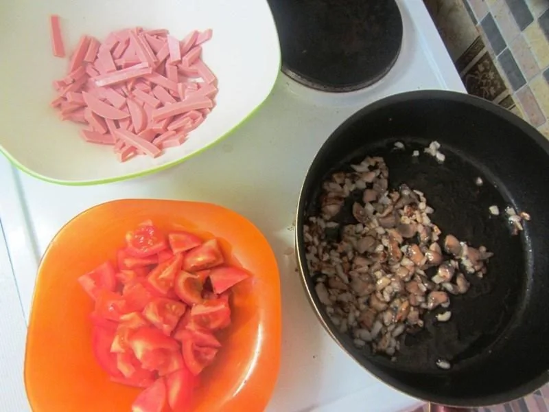 ШАГ 2 Нарезаем помидоры дольками, ветчину соломкой, смешиваем с кукурузой, добавляем остывшие грибы и заправляем майонезом, при необходимости солим.