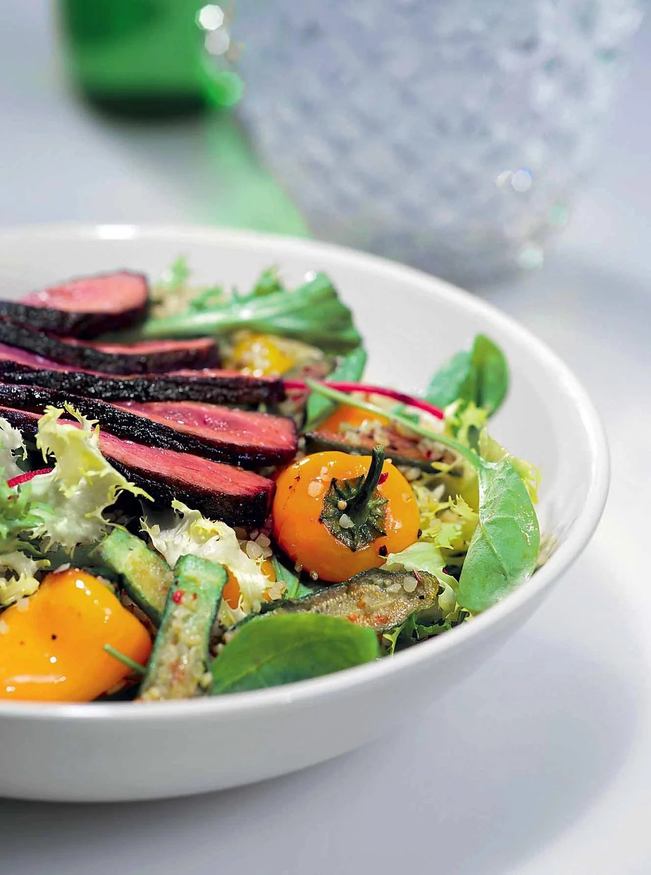 ШАГ 6 В большой миске смешать булгур с салатными листьями и обжаренными овощами, заправить оливковым маслом. Сверху выложить мясо, нарезанное тонкими ломтиками.