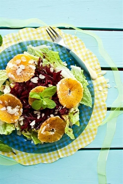 ШАГ 4 Выложите на тарелки ромэн, выложите сверху тертую свеклу и кружки апельсина.