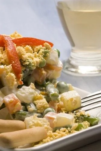 Картофель Морковь Лук репчатый Маринованные огурцы Яблоко Зеленый горошек Куриная грудка Копченая индейка Телятина Яйцо куриное Майонез Оливковое масло Горчица Соль Сладкий перец Лимон Анчоусы Салаты Французская кухня Оливье