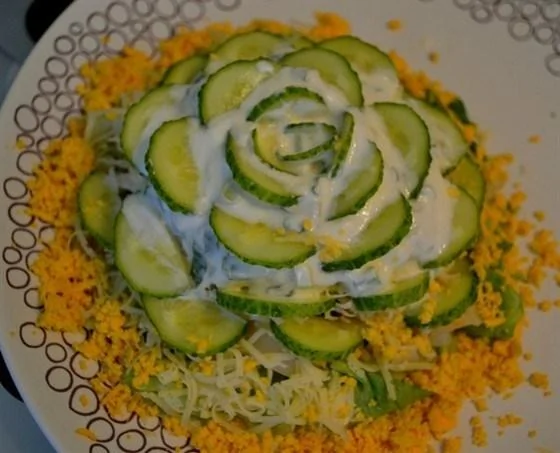 ШАГ 4 Выкладывать слоями ингредиенты, смазывая каждый слой заправкой: салат, кальмары, грибы, сыр (100 грамм), дайкон, белок, сыр; полить заправкой и украсить в виде цветка порезанными огурцами. Основу салата присыпать желтком.