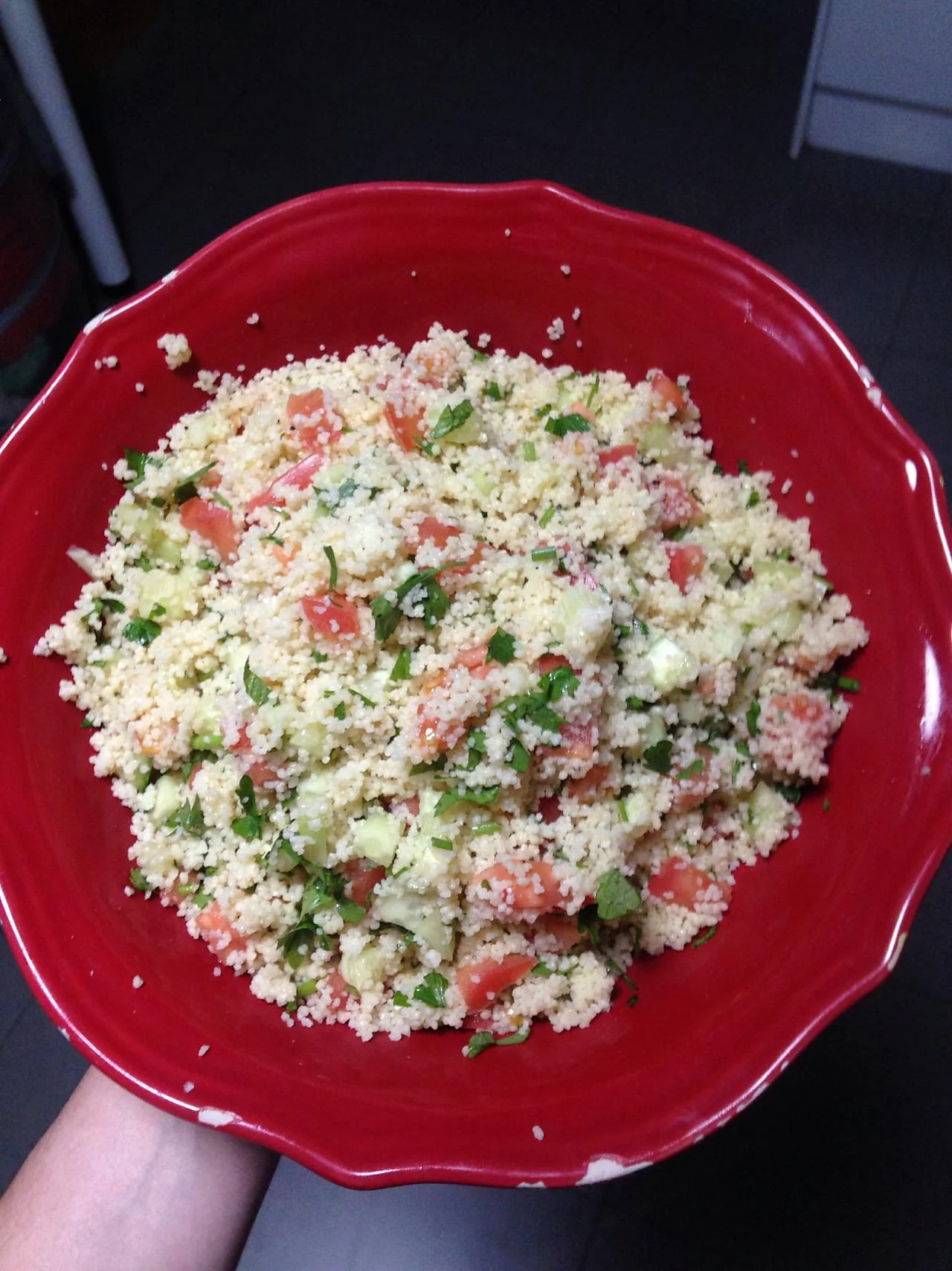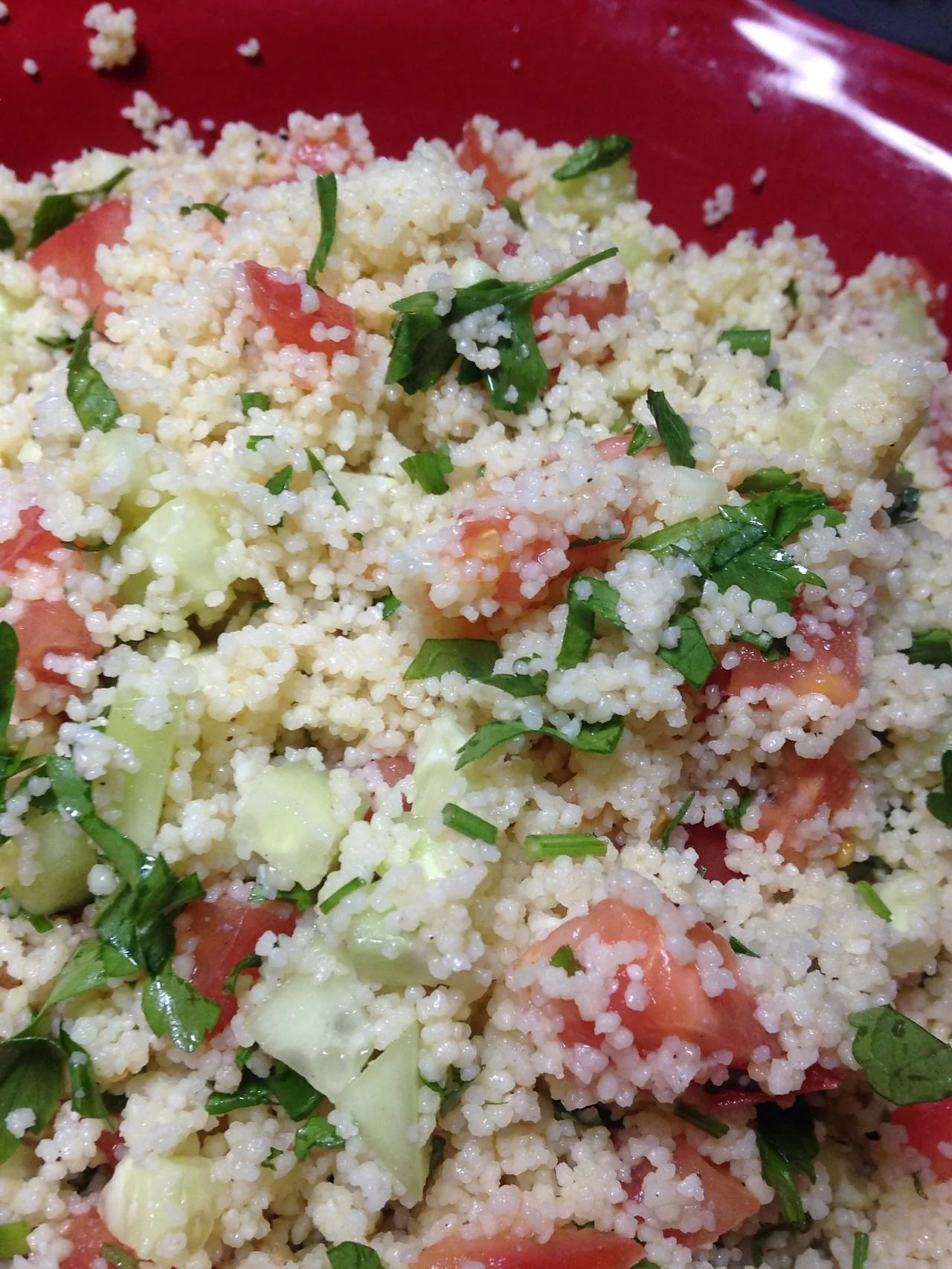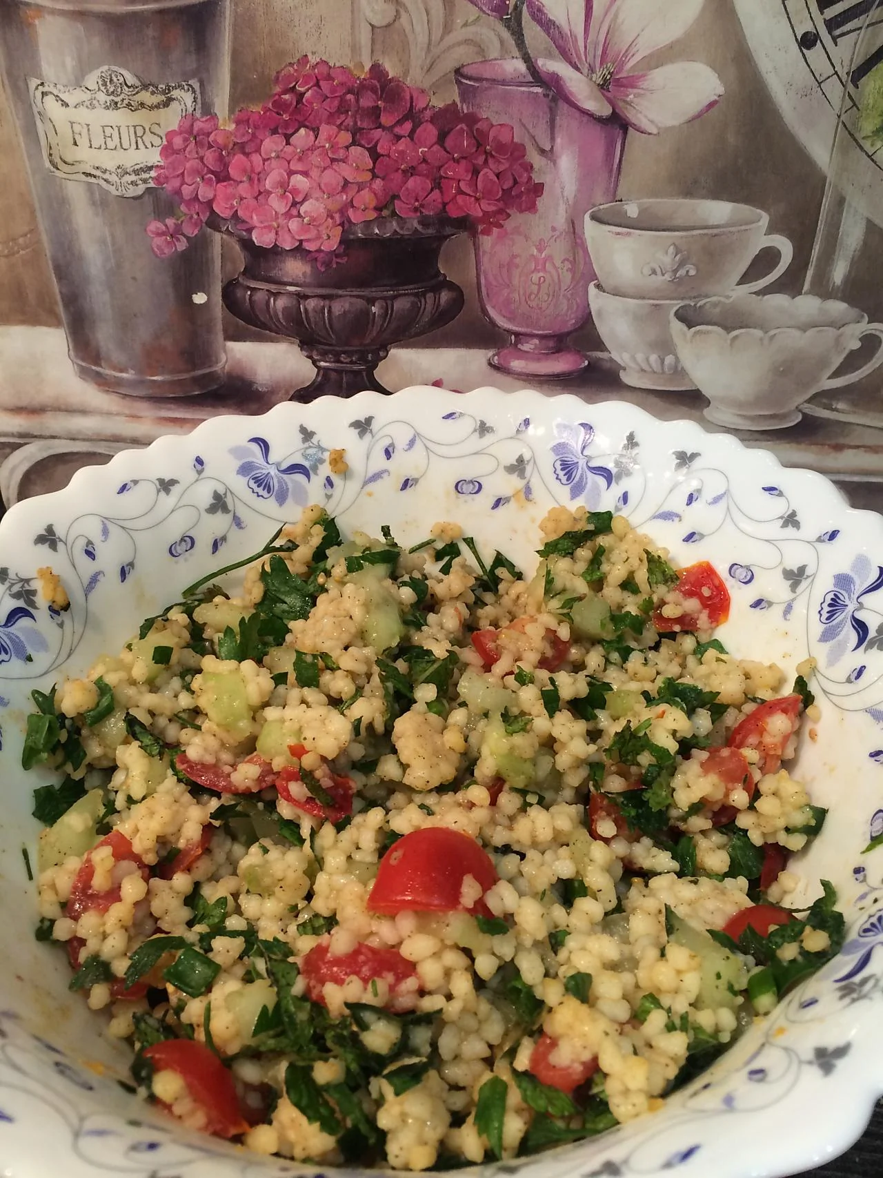 ШАГ 4 Добавить овощи и зелень к остывшей подготовленной крупе, перемешать, посолить, поперчить, заправить лимонным соком и оливковым маслом.