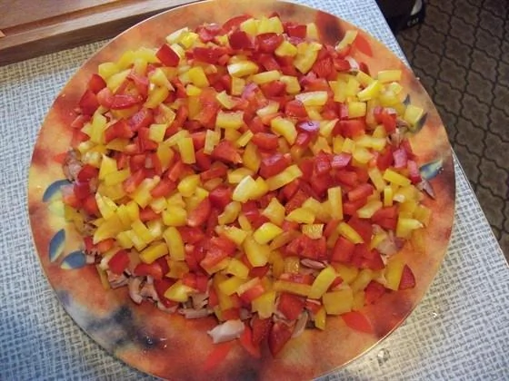 ШАГ 2 2 слой — нарезать перец болгарский, затем смазать майонезом.