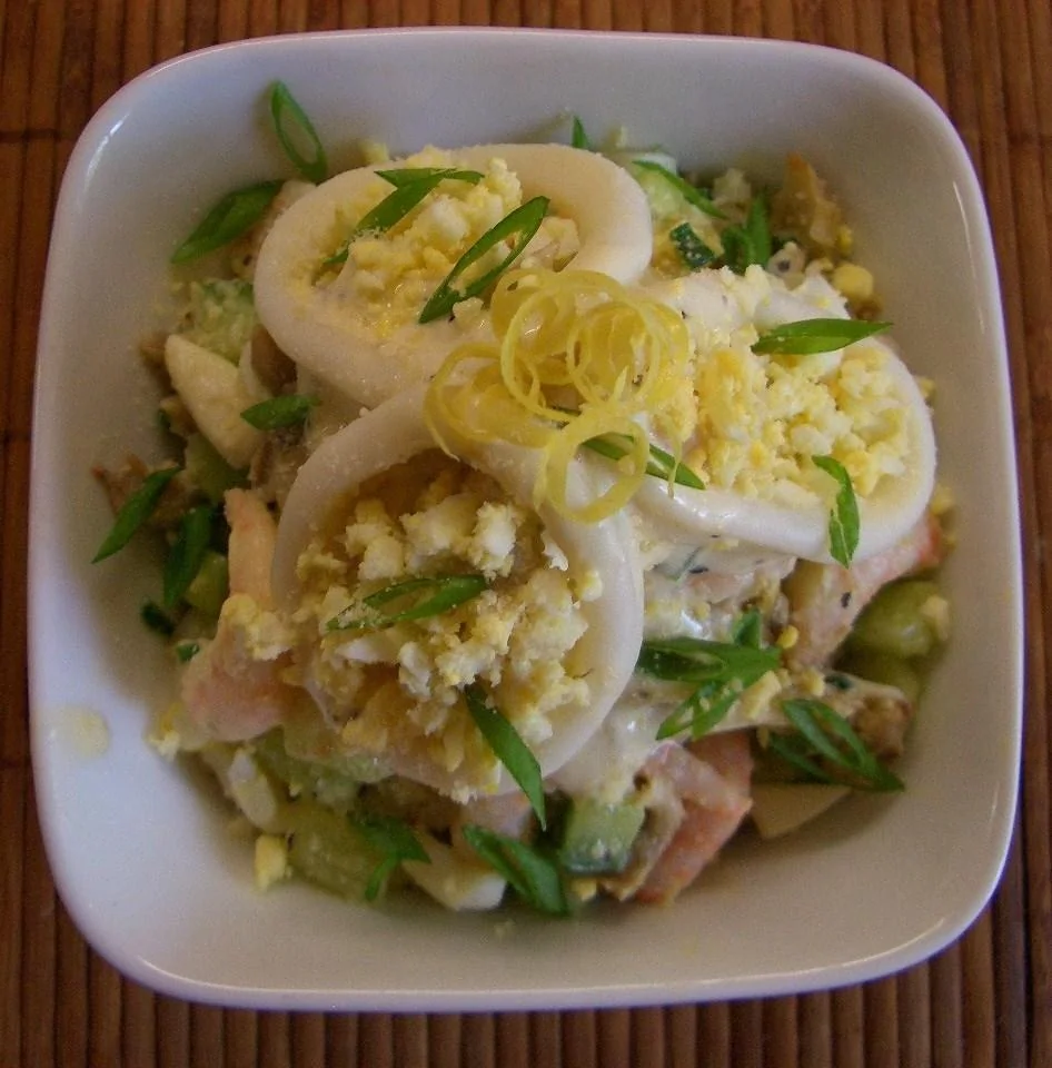 Салат из кальмаров и креветок с огурцом в лимонно-сметанном полушубке