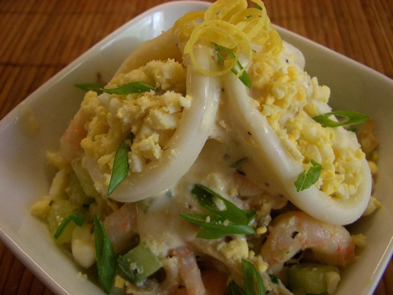 ШАГ 10 Выложить горкой в салатники, положить на верхушку по три кольца кальмара, заполните серединки рубленным яйцом, аккуратно полить сверху соусом. Посыпать зеленым луком, сверху украсить стружкой из цедры.