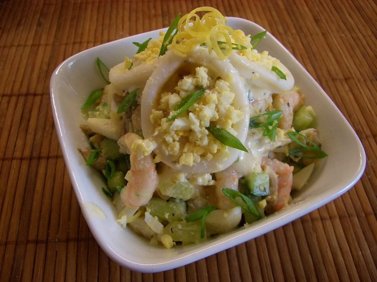 ШАГ 3 Кальмара отварить, остудить, порезать на кольца для украшения и ломтиками непосредственно в салат.