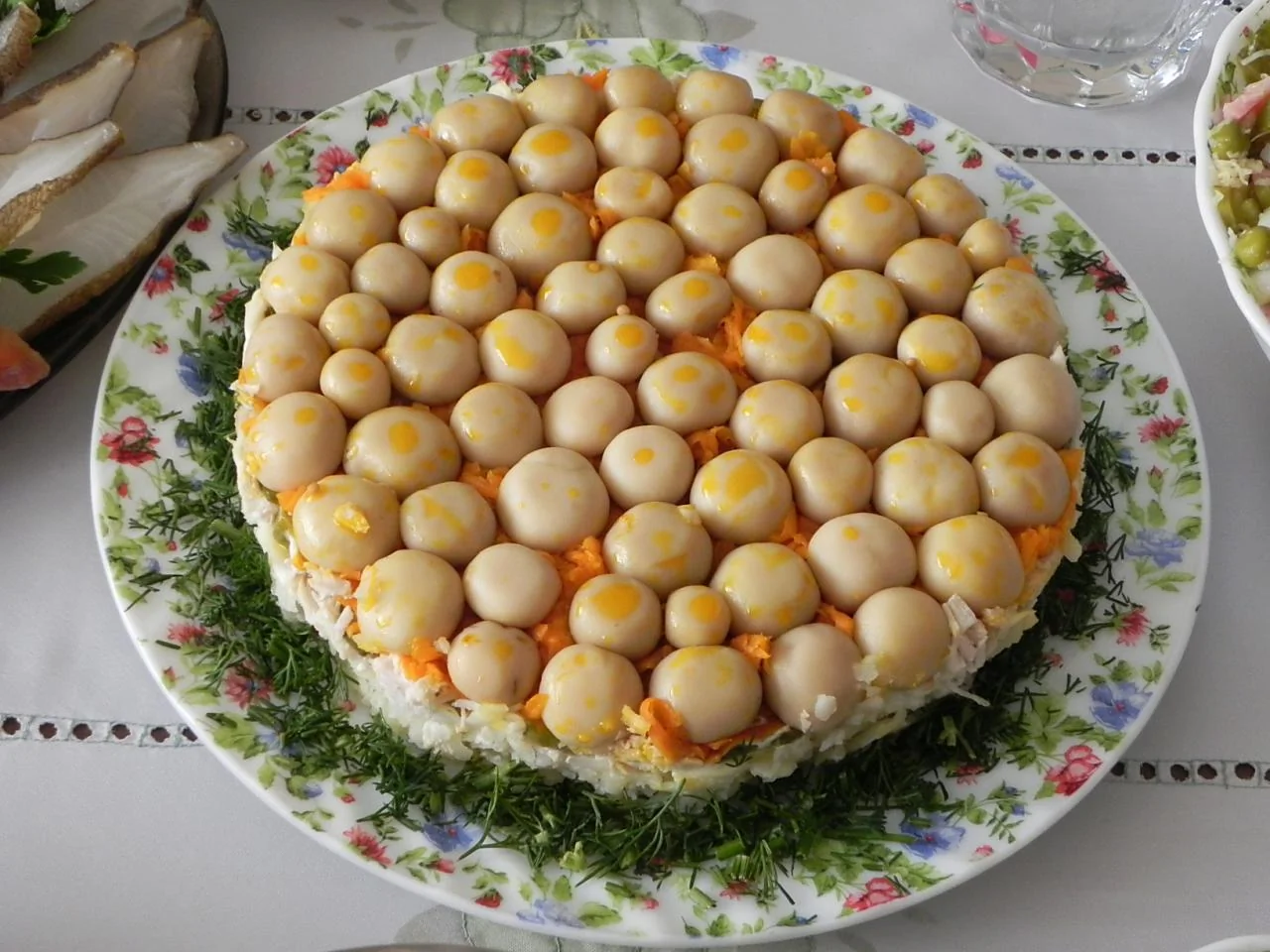 Слоеный салат с грибами, мясом и плавлеными сырками
