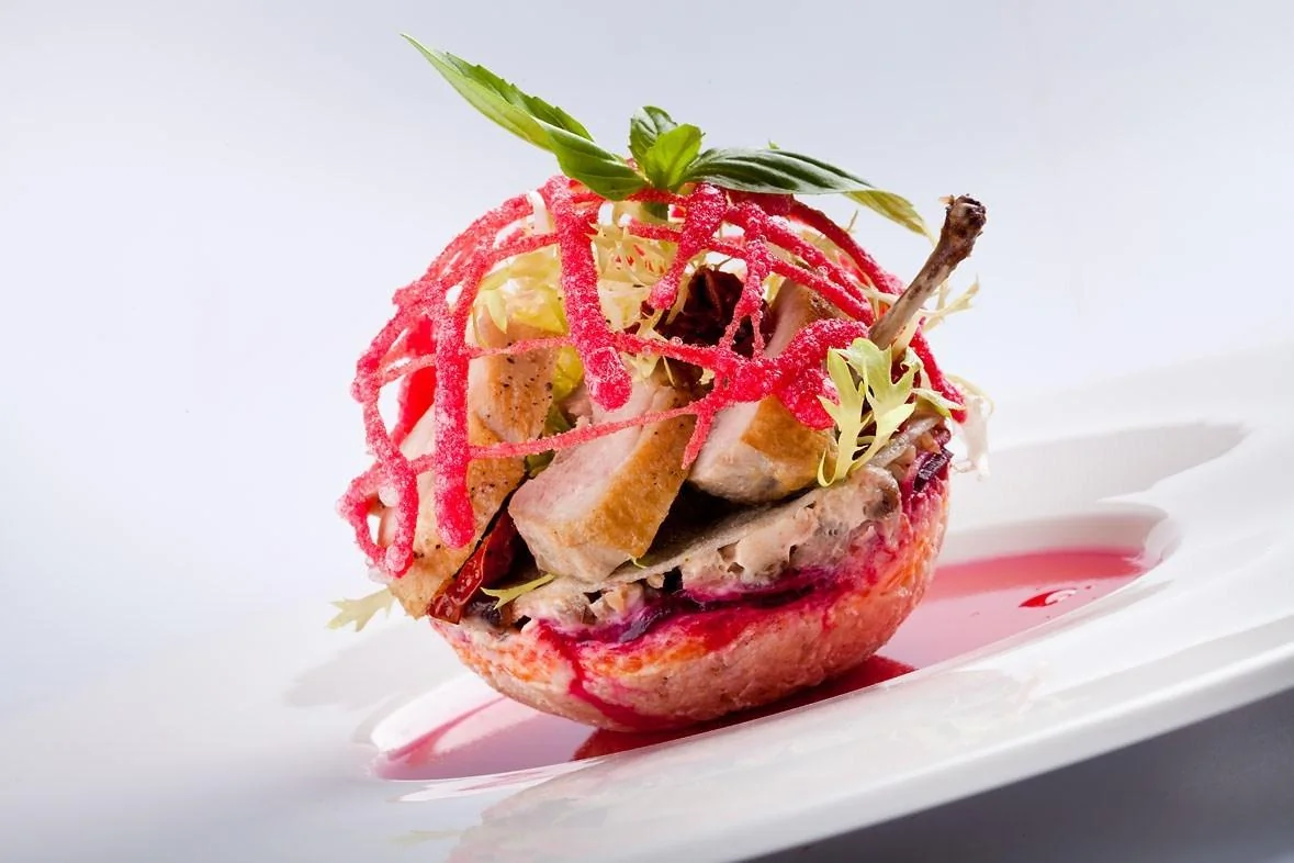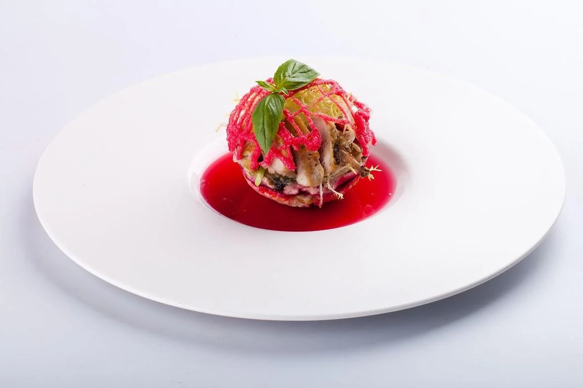 ШАГ 6 Все ингредиенты выложить слоями, сверху выложить салат фризе, вяленые помидоры и грудку перепела (заправить маслом лесного ореха), декорировать свекольными чипсами и веточкой базилика.