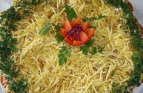 ШАГ 4 Четвертый слой — порезать картофель соломкой, обжарить, как картофель фри, подсушить на салфетке, чтобы избавиться от лишнего жира и положить четвертым слоем!