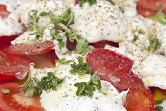 ШАГ 1 Помидоры вымыть, нарезать кружочками, добавить натертую брынзу, посыпать зеленью петрушки и заправить сметаной.
