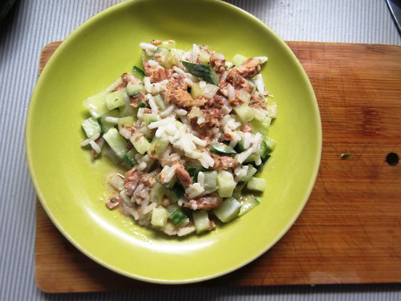 ШАГ 3 Чтобы не забивать вкус продуктов большим количеством майонеза, для этого в рис нужно вылить жидкость от рыбы и перемешать. Потом добавить огурцы, лук и снова перемешать.