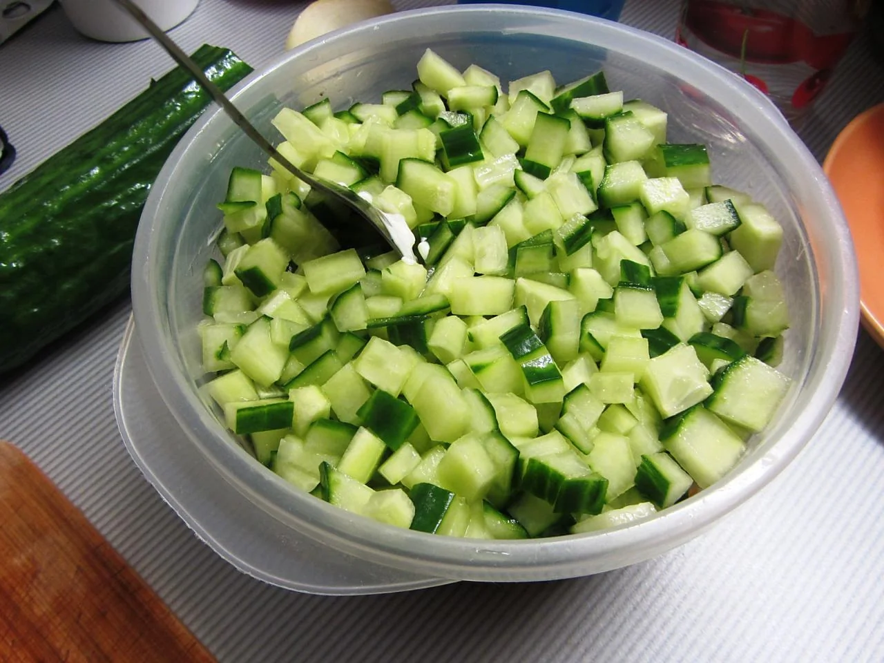 ШАГ 2 Огурцы порезать маленькими кубиками, зеленый лук измельчить.