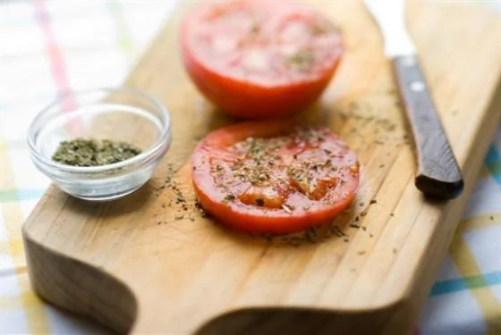 ШАГ 1 Каждый помидор разрезать пополам и разложить по противню срезом вверх. Посолить и поперчить. Равномерно посыпать чесноком и сбрызнуть оливковым маслом. Сверху уложить по листику базилика (листья должны быть покрыты маслом с двух сторон).