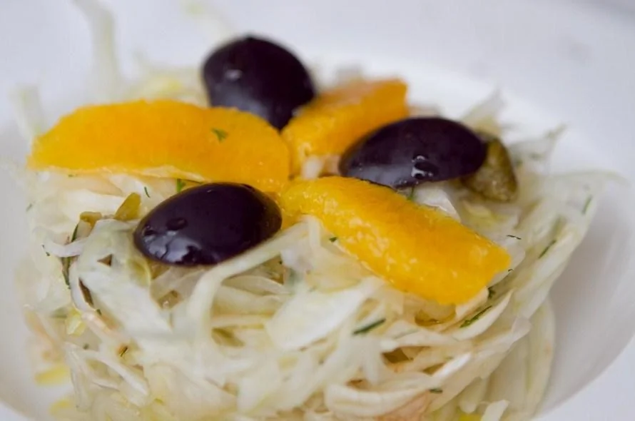 ШАГ 6 В салатник выложить подготовленный фенхель. Заправить соусом, добавить зелень, каперсы, все хорошо перемешать.