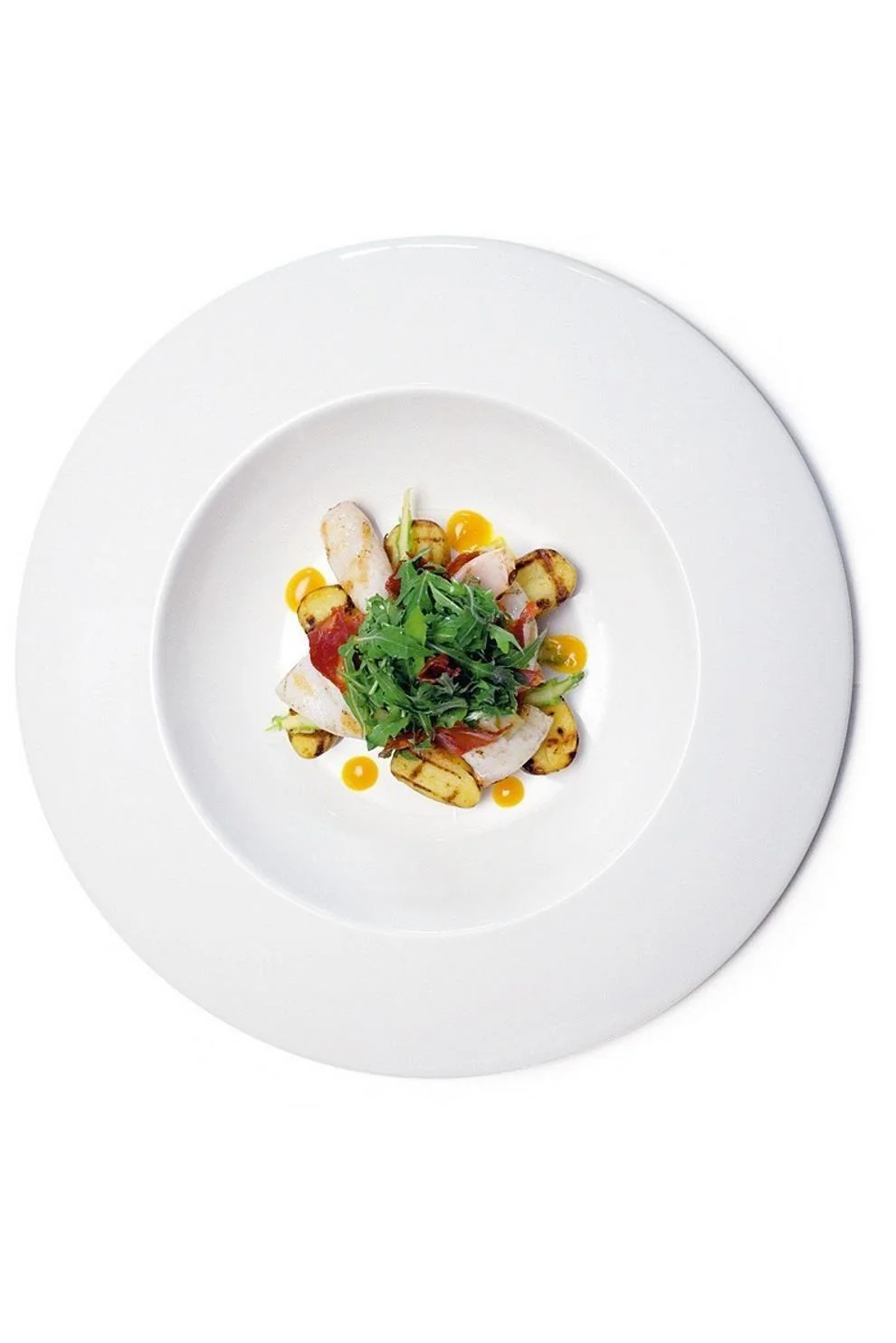 Салат из жаренного на гриле кальмара, молодого картофеля и чоризо с листьями рукколы и мякотью маракуйи