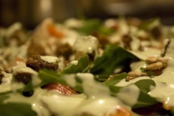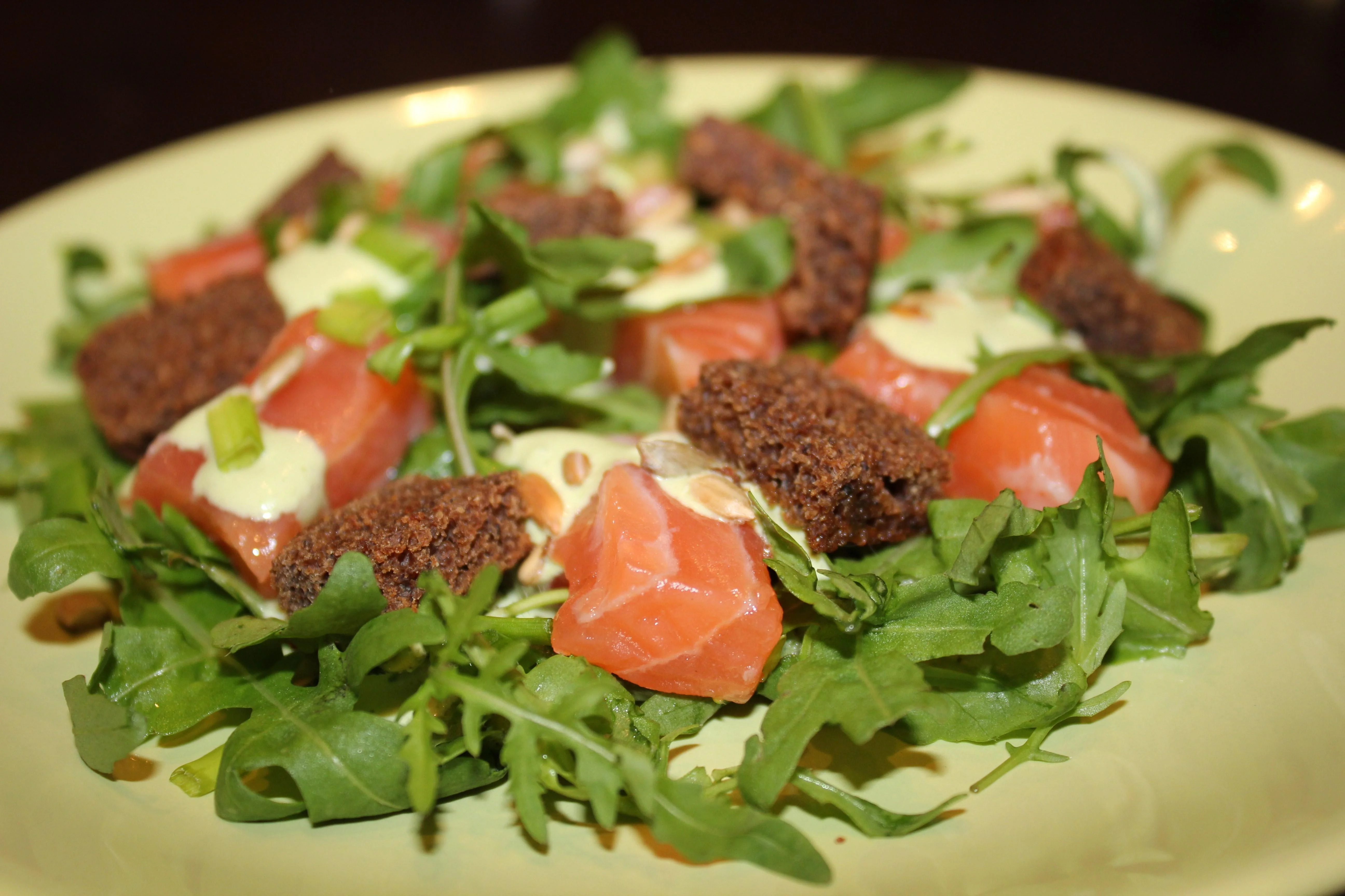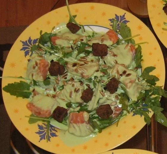 ШАГ 5 На тарелки уложить руколу, пристроить в ее заросли несколько кусочков маринованной рыбы, живописно набросать ржаных сухариков, посыпать семечками и щедро сдобрить весь этот вертоград сметанно-луковым соусом. Солить не надо. Даже малосоленый лосось достаточно солон.