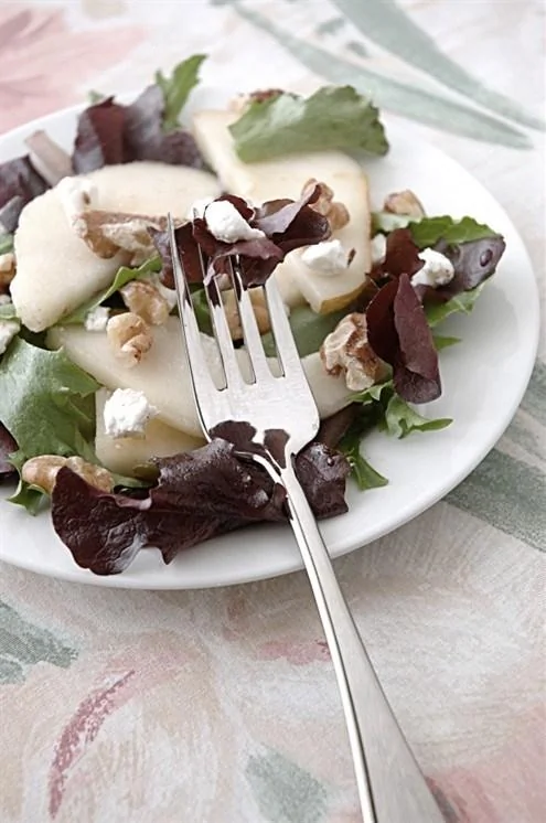 ШАГ 8 Распределить листья салата по 4 тарелкам, выложить груши, посыпать грецкими орехами и полить соусом.