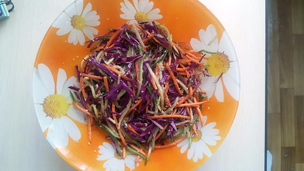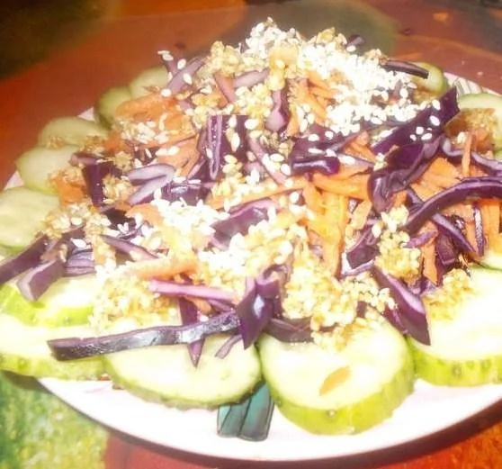 ШАГ 5 Колечки огурца укладываем на тарелку, сверху кладем капусту и морковь. Поливаем заправкой, посыпаем черным и белым кунжутом. Подаем.