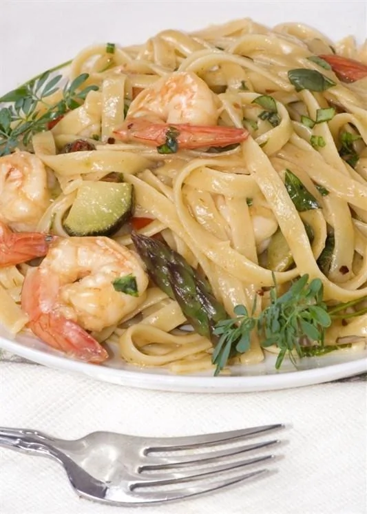 ШАГ 4 Макароны перемешать с цукини, креветками, оливками и салатными листьями. Затем порубить перец на небольшие куски и добавить его в полученную смесь.