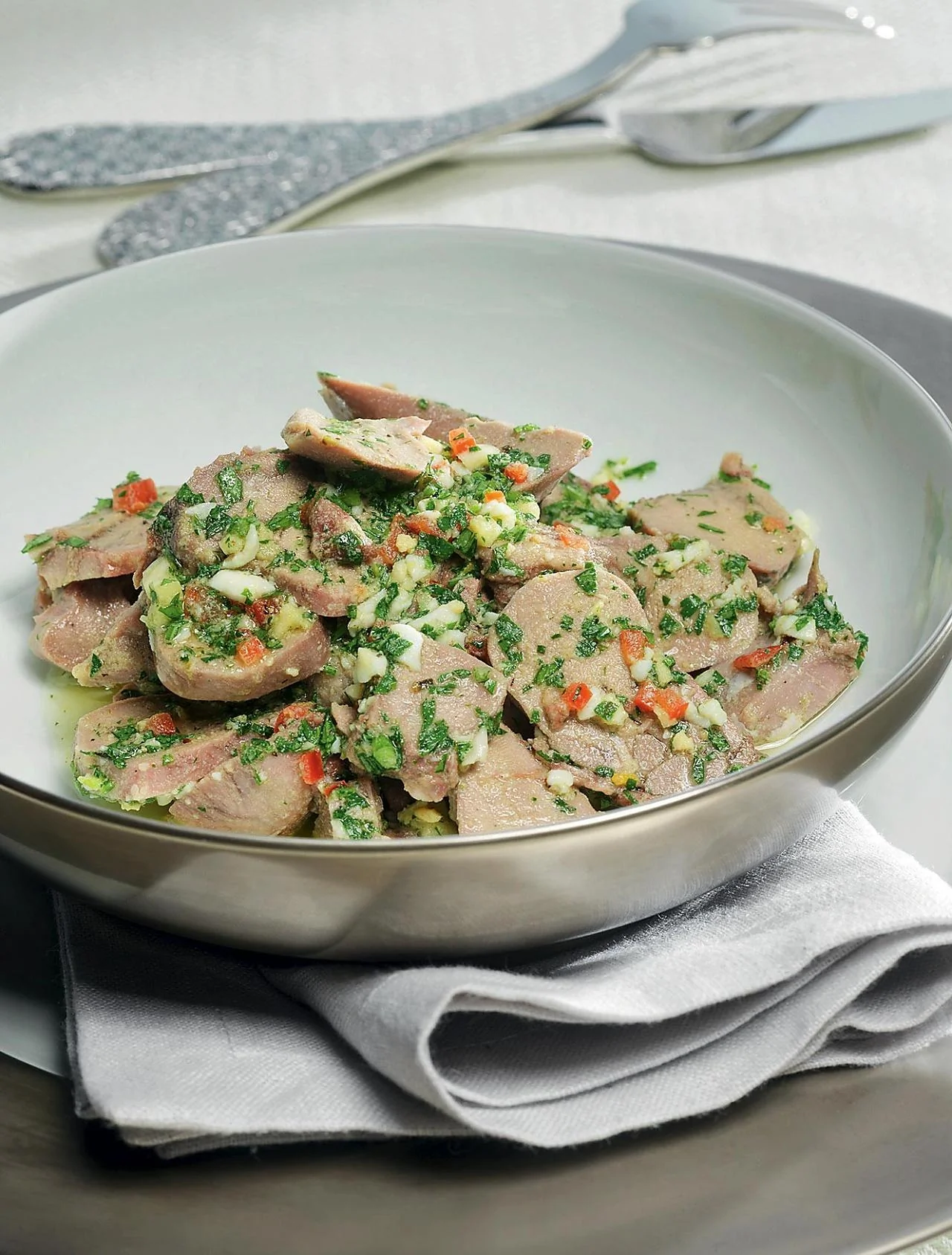 ШАГ 1 Языки нужно предварительно отварить. Головку лука слегка обжарить на сковороде, добавить к залитым водой языкам вместе с лавром, горошинами черного и душистого перца и солью — и варить четыре часа после закипания. Охладить языки и очистить их от пленок.