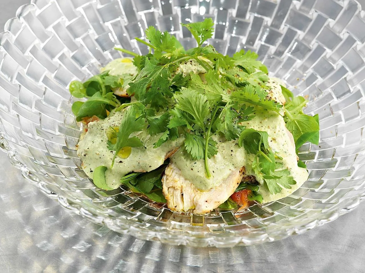 ШАГ 4 Листья корна смешать с подвяленными томатами и выложить в центр тарелки, пристроить сверху ломтики цыпленка. Полить его соусом сациви и посыпать листьями кинзы.