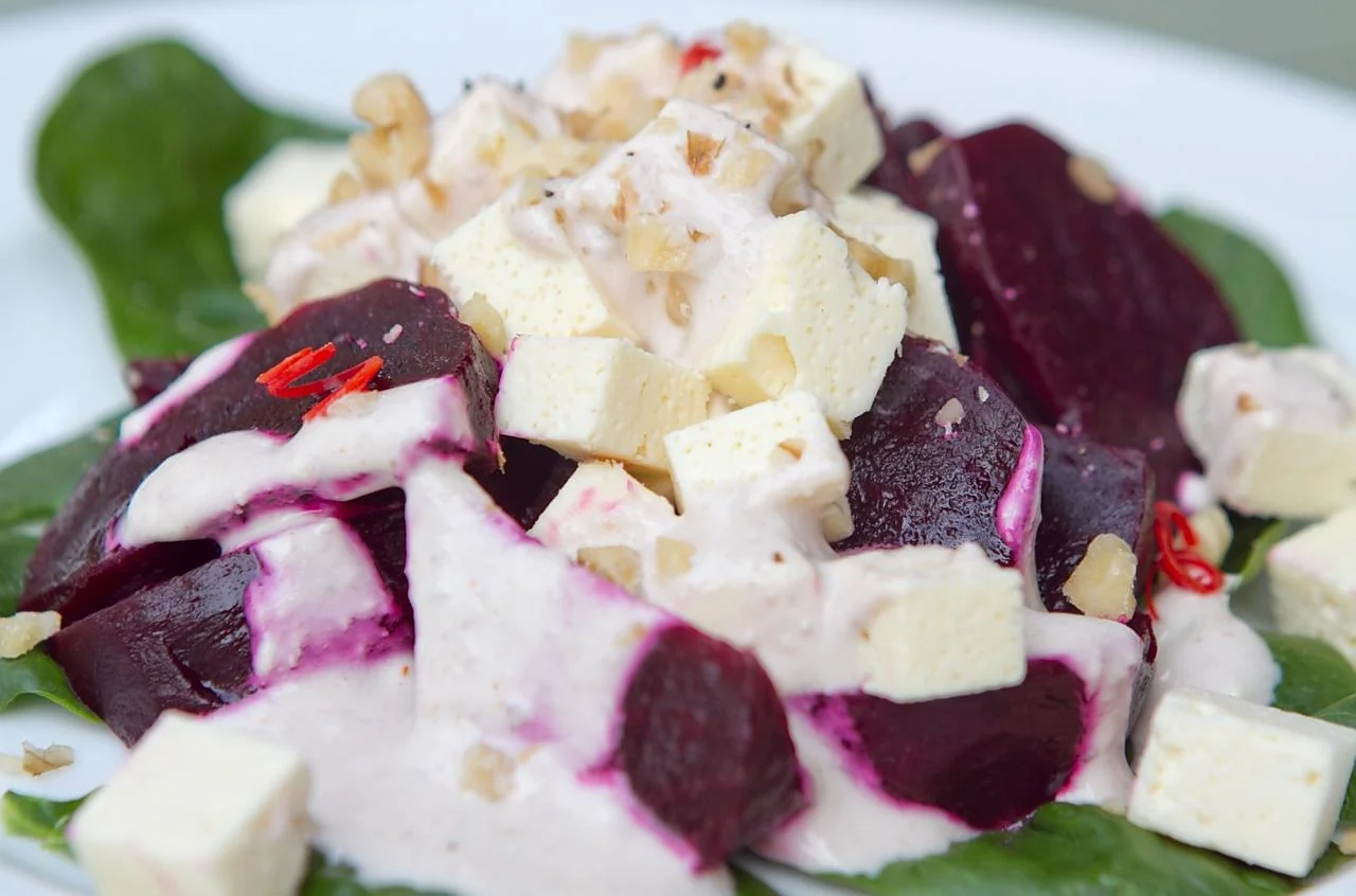 ШАГ 4 На шпинат выкладывают нарезанную свеклу, сверху свеклы — сыр.