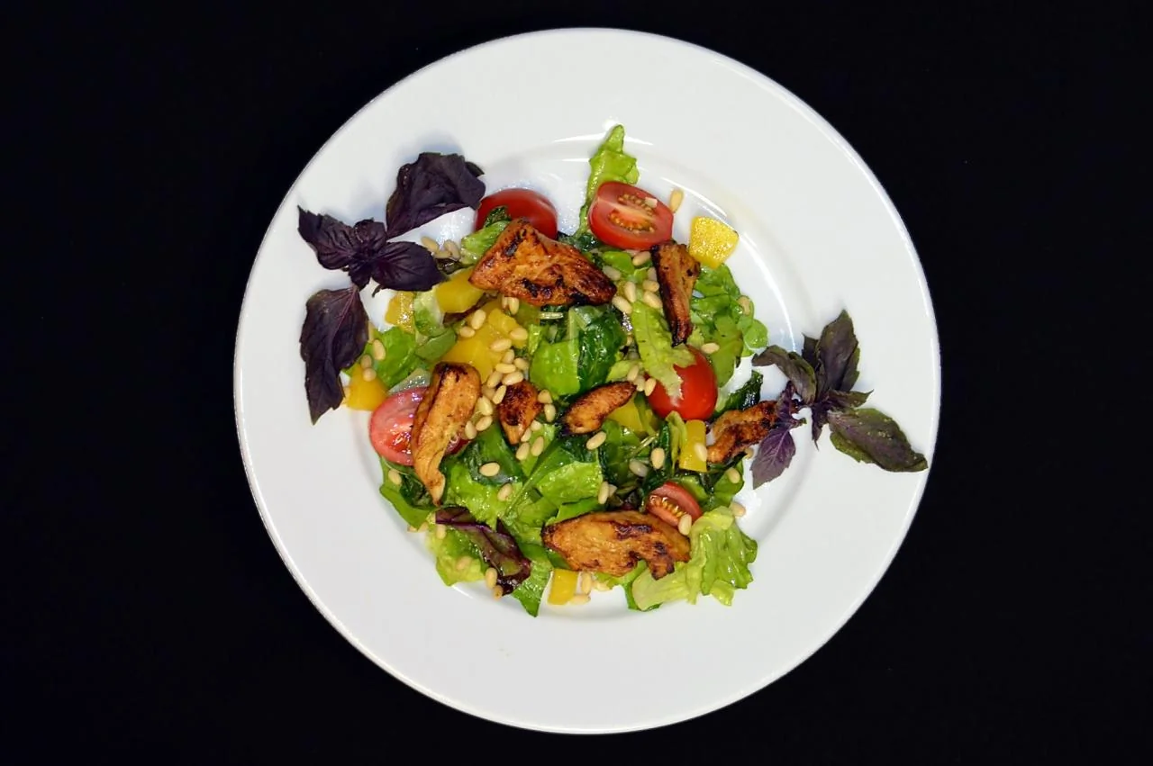 ШАГ 11 Посыпьте салат кедровыми орешками, украсьте листьями базилика и подавайте к столу.