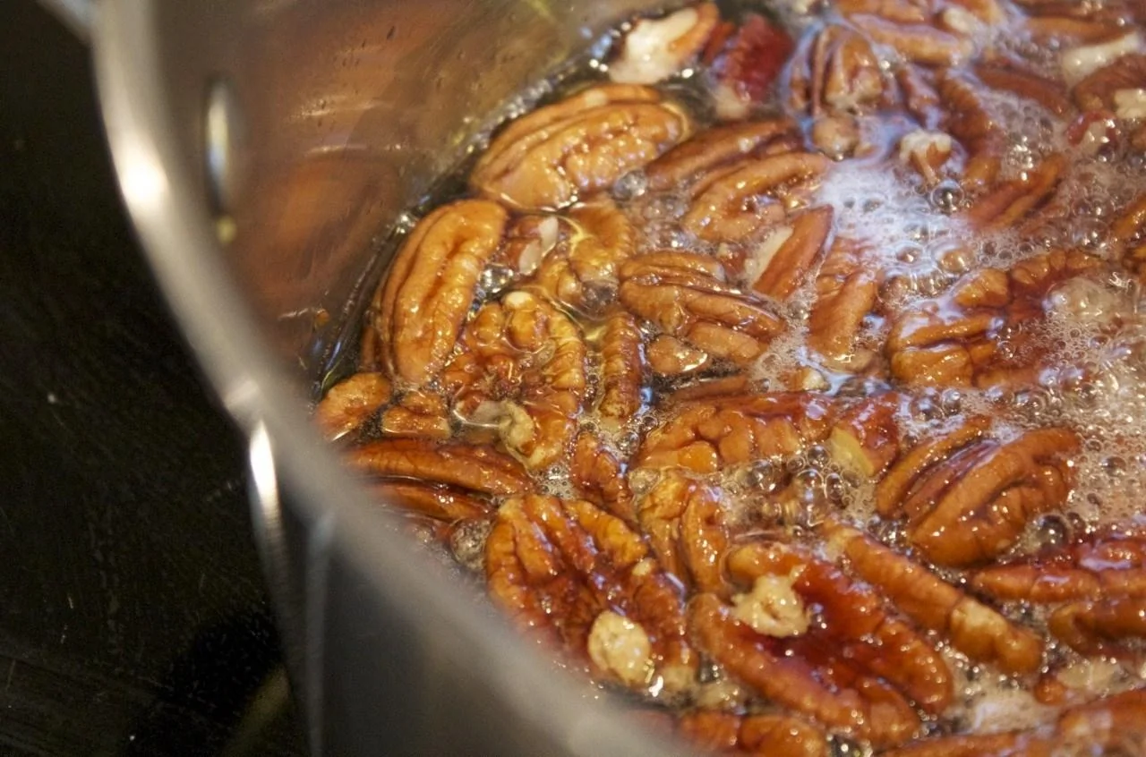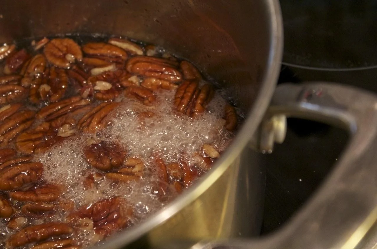 ШАГ 2 Кода вода начинает кипеть, добавляем орехи в кастрюльку и варим так на среднем огне, пока жидкость не станет тягучей, как сироп.