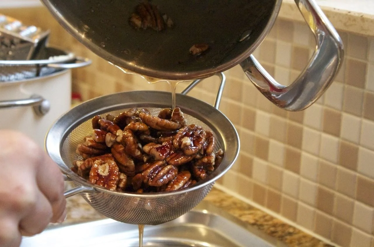 ШАГ 4 Откидываем орехи на дуршлаг и даем стечь. Тем временем, ставим на огонь сковороду и наливаем в нее масло.