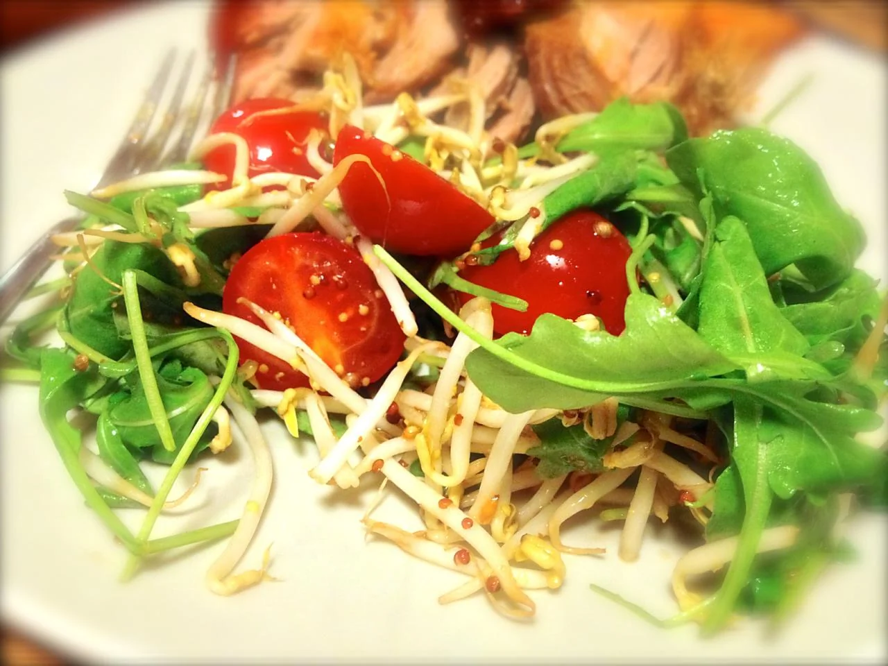 Салат из помидоров черри, проростков сои и рукколы с пикантным сладковатым соусом