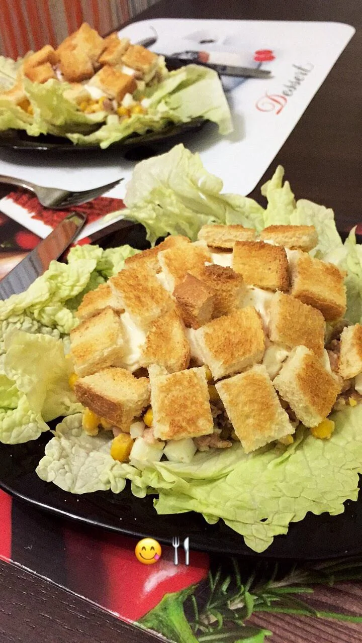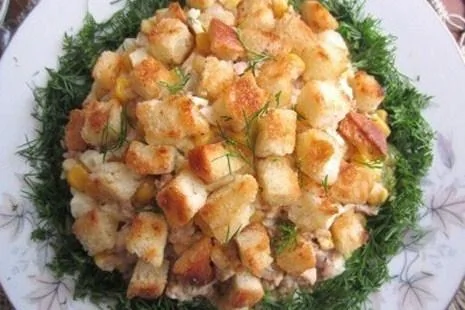 Салат из печени трески с гренками