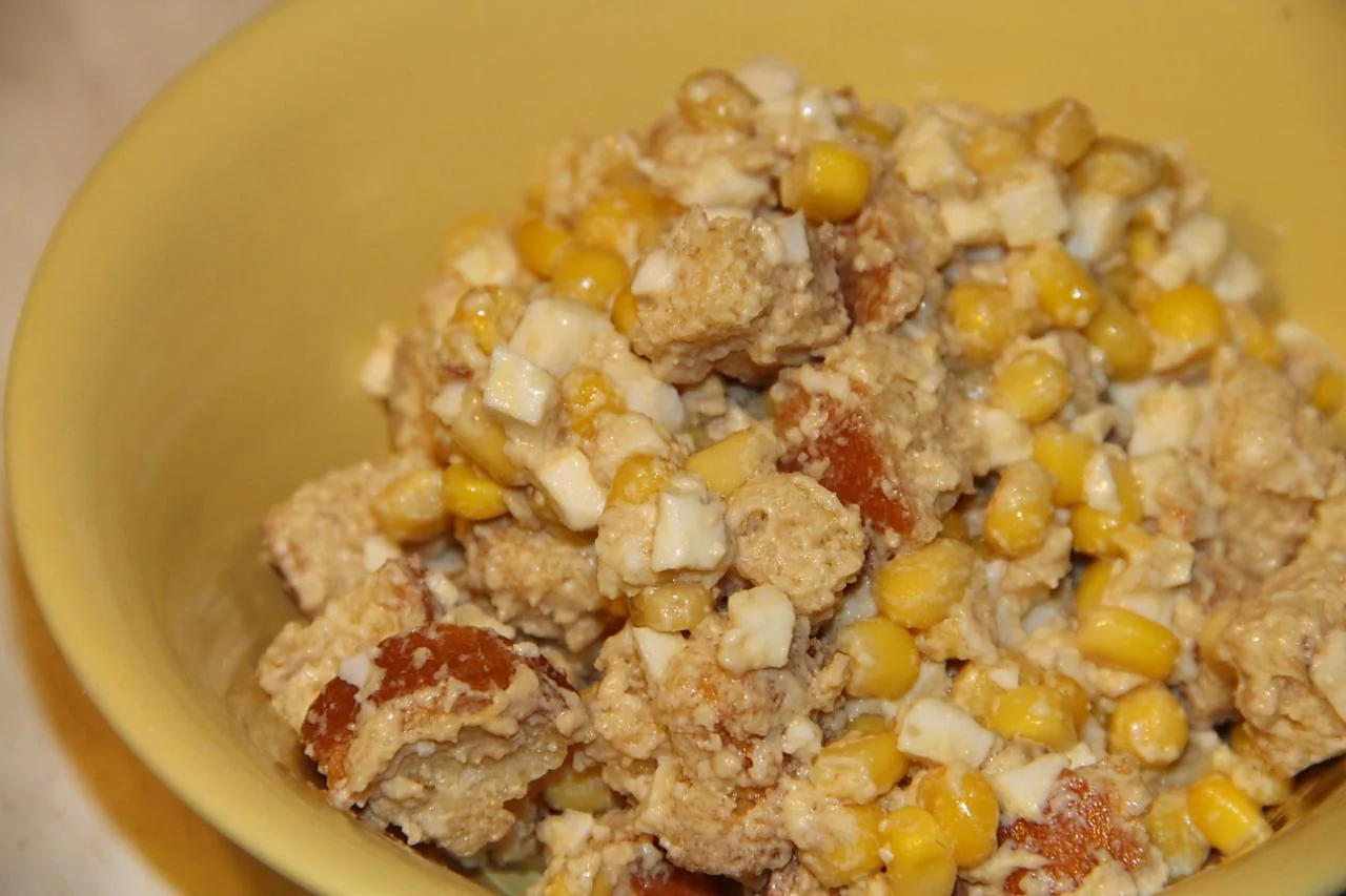ШАГ 3 С печени трески слить масло, размять вилкой, добавить измельченные яйца, кукурузу и майонез.