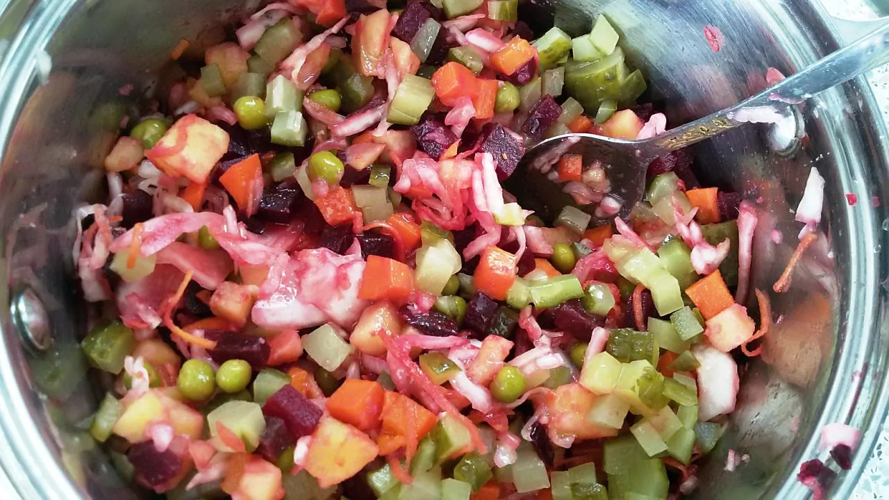 ШАГ 2 Лук, огурцы, морковь, картофель и свеклу натереть на крупной терке. Добавить капусту. Посолить, поперчить. Заправить винегрет маслом и уксусом или лимонной заправкой.