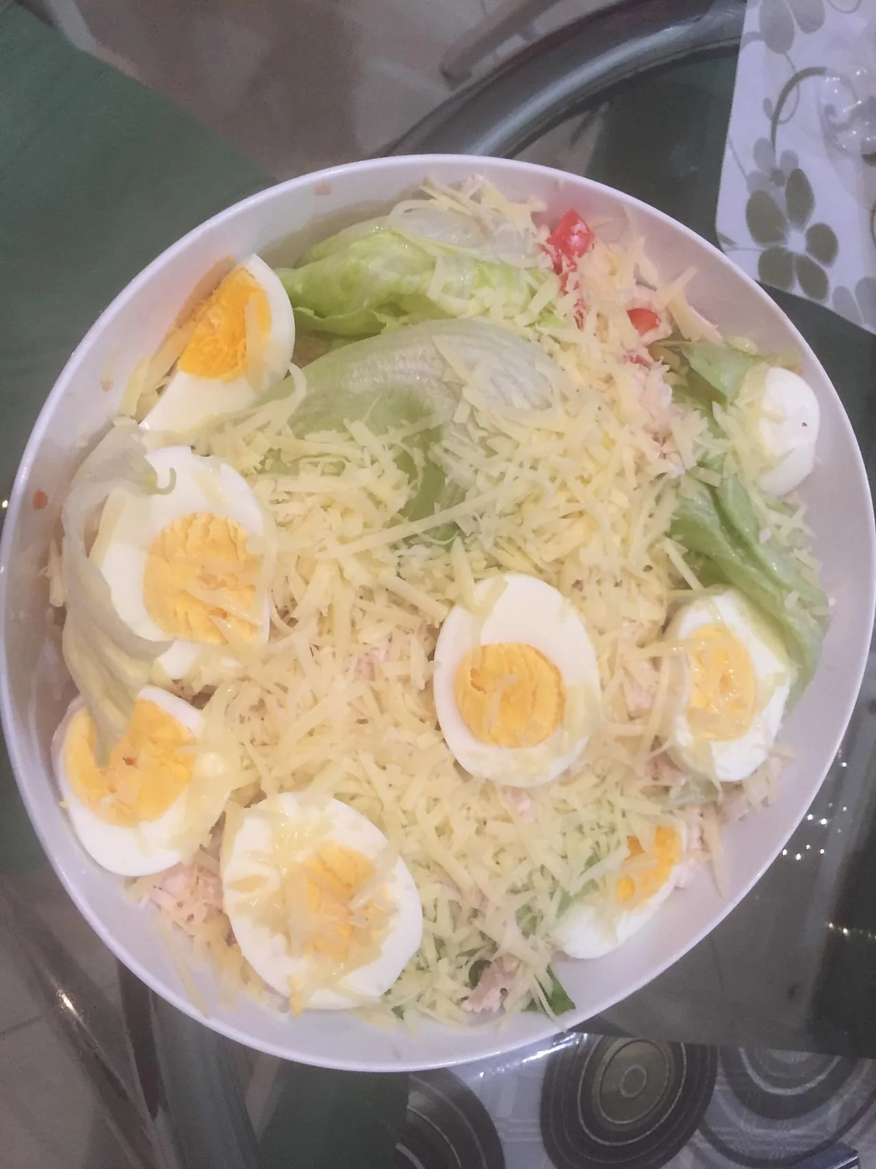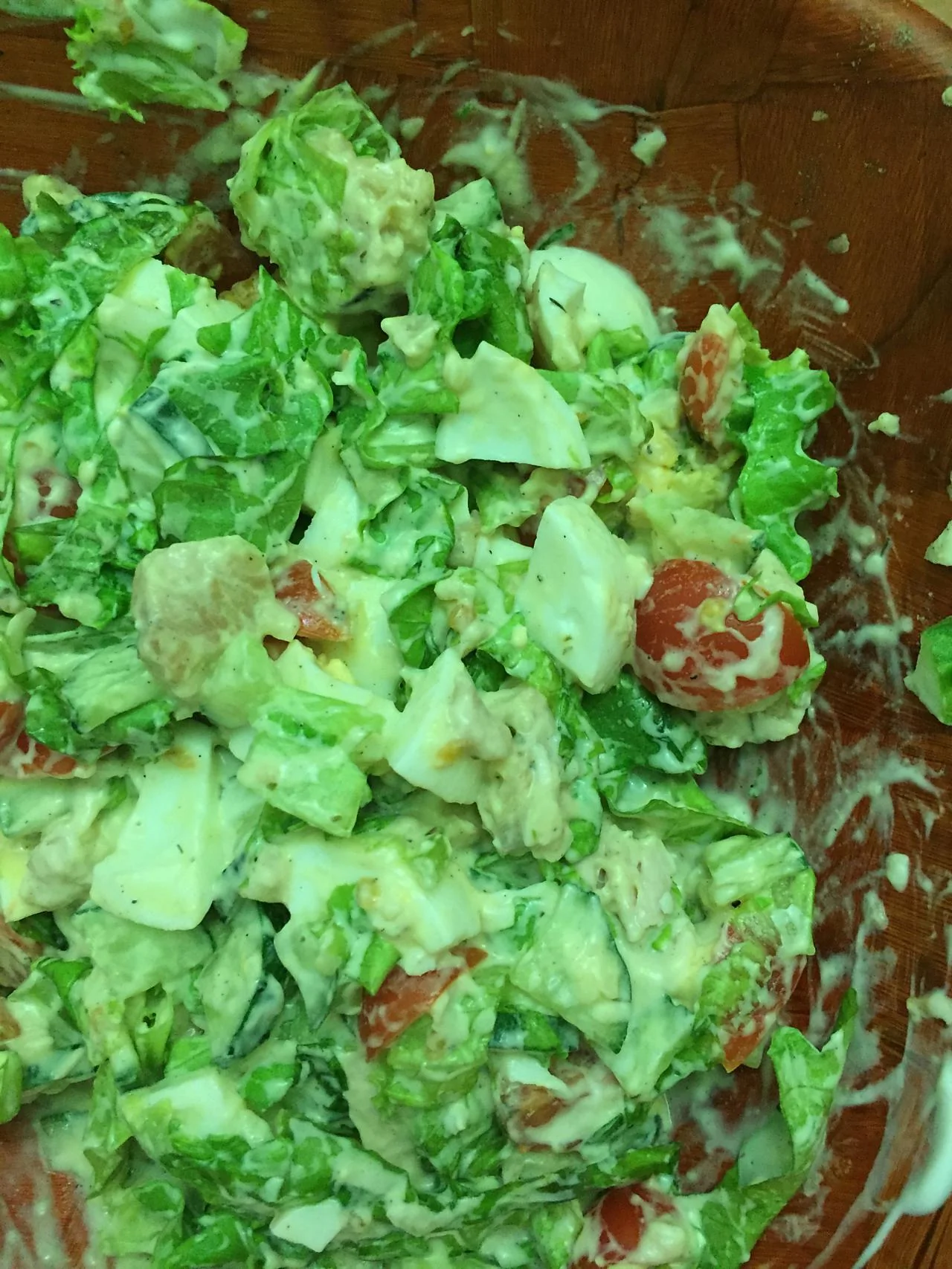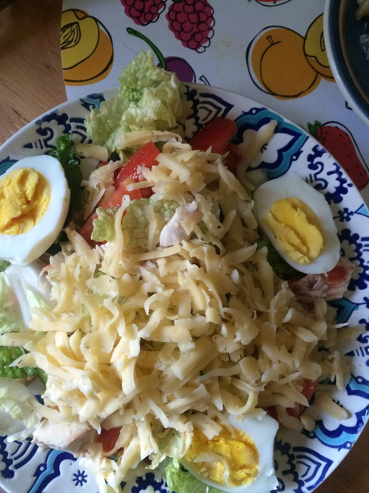 ШАГ 1 Смешать нарезанный или порванный руками салат, нарезанную курицу, нарезанные огурцы, помидоры, натереть сыр, добавить половинки сваренных вкрутую яиц.